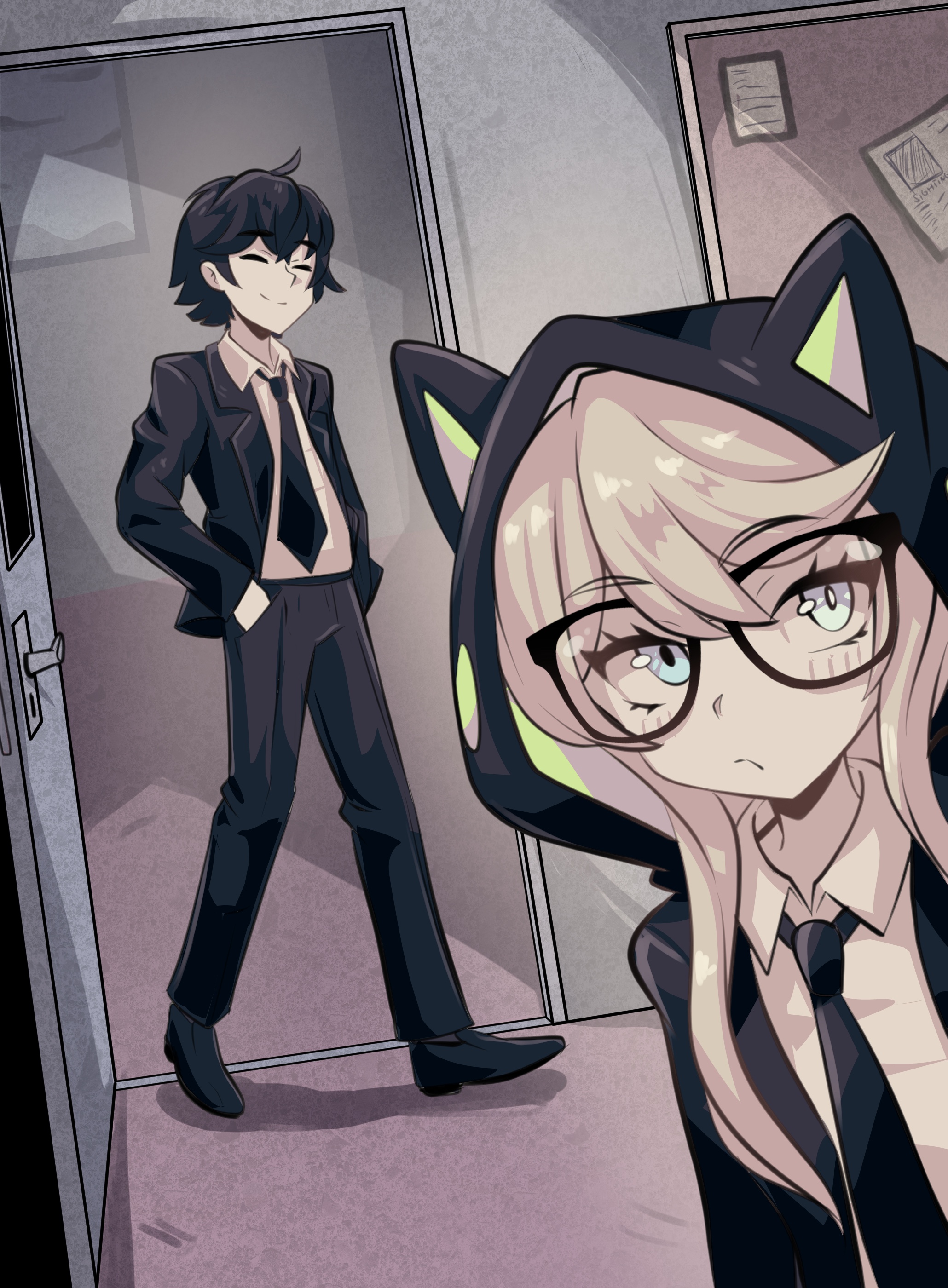 1boy1girlanimal hoodblack hairblack hoodieblack jacketblack necktieblack pantsblack shoesblack-framed eyewearblazerblonde hairblue eyescat hoodclosed eyesclosed mouthdoorwayglasseshands in pocketshoodhoodiejacketlooking at viewernecktieopen clothesopen jacketpantsschool uniformshoessmilewalking