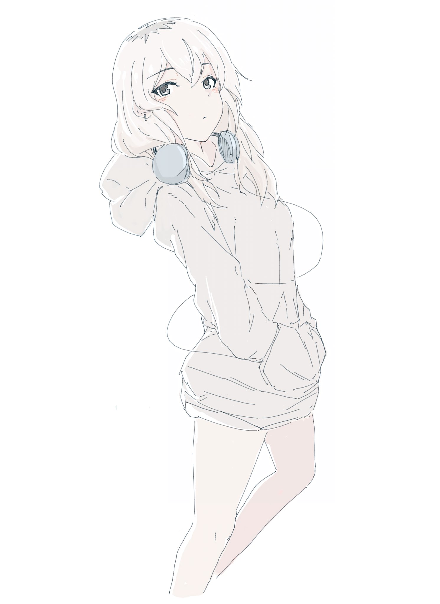 1girlear piercinggrey eyesgrey hairgrey hoodiehair between eyeshands in pocketsheadphonesheadphones around neckhoodhood downhoodielong hairlong sleevesmulticolored hairpiercingroots (hair)simple backgroundsolowhite background