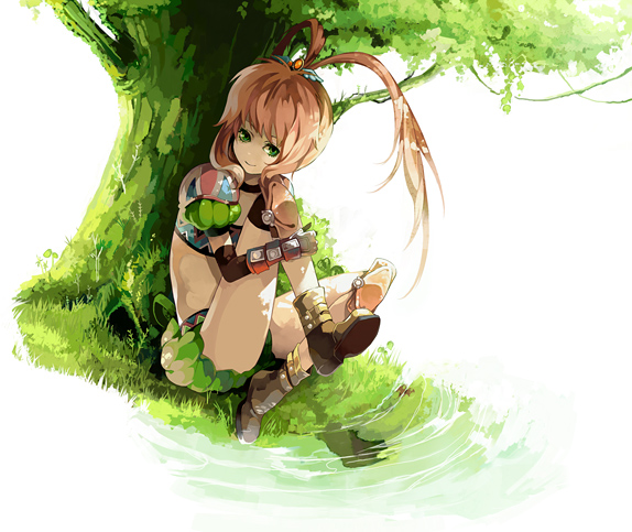 1girlfemale focusgreen eyeslong hairlooking at viewermidriffoutdoorsponytailsittingsolotreewater