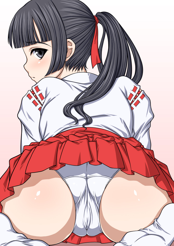1girlassblack haircameltoecome hitherfeetfemale focushakamahakama skirtjapanese clotheslong hairlooking backmikopantiesponytailred hakamasittingskirtsockssolounderwear