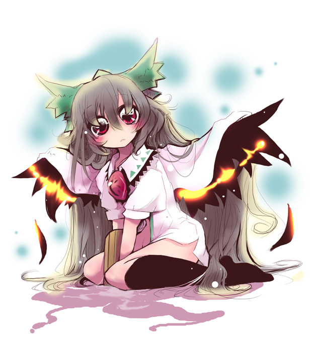 1girlblushbottomlessbrown haircapefemale focusgradient backgroundlong hairno pantiesred eyesribbonsolowhite backgroundwings