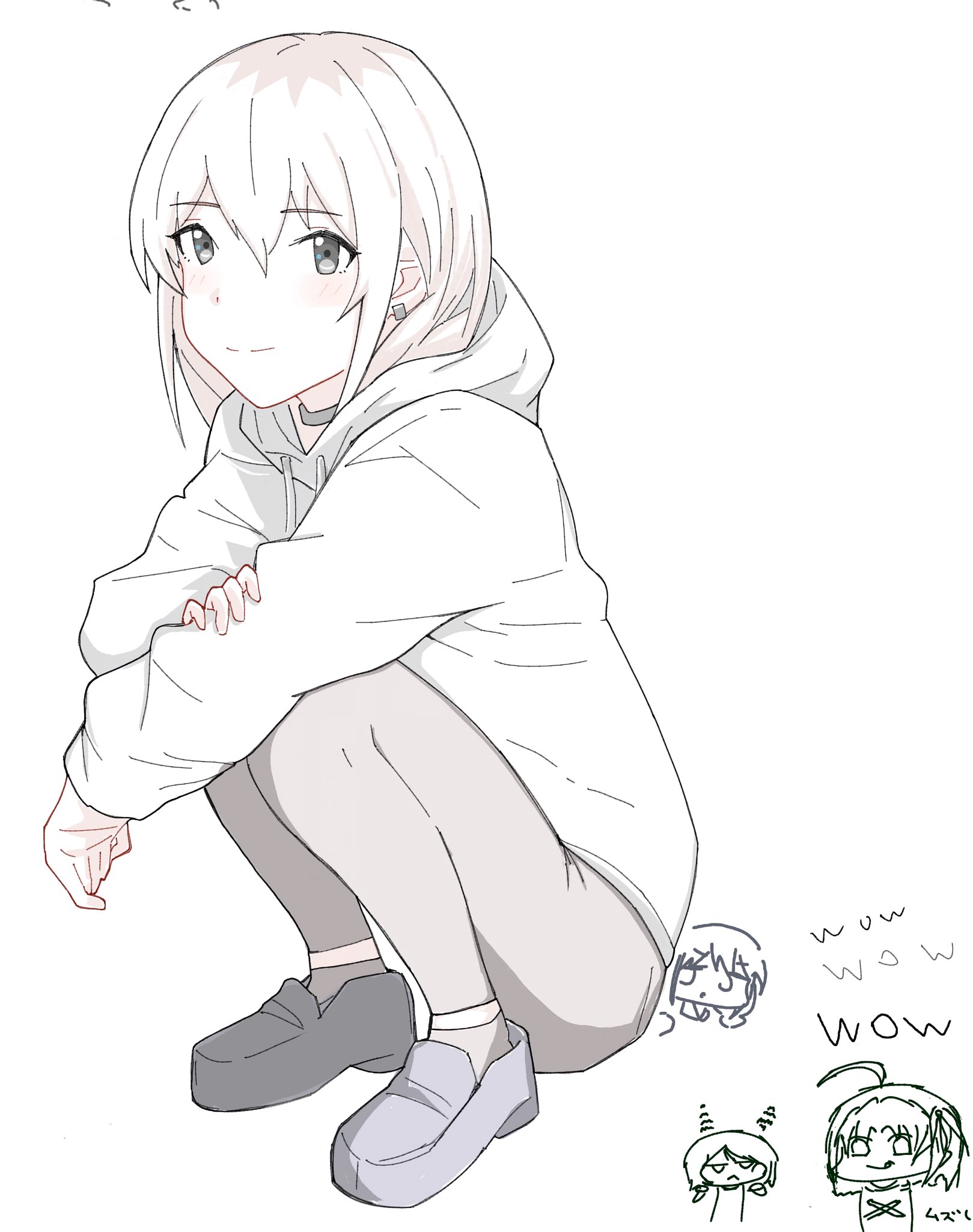 3girlsahogeblack chokerblack shoesblushchokerclosed mouthearclipgrey eyesgrey hairgrey pantshoodhood downhoodielong sleevesmulticolored hairmultiple girlspantsroots (hair)shoessimple backgroundsolo focussquattingwhite backgroundwhite hoodie