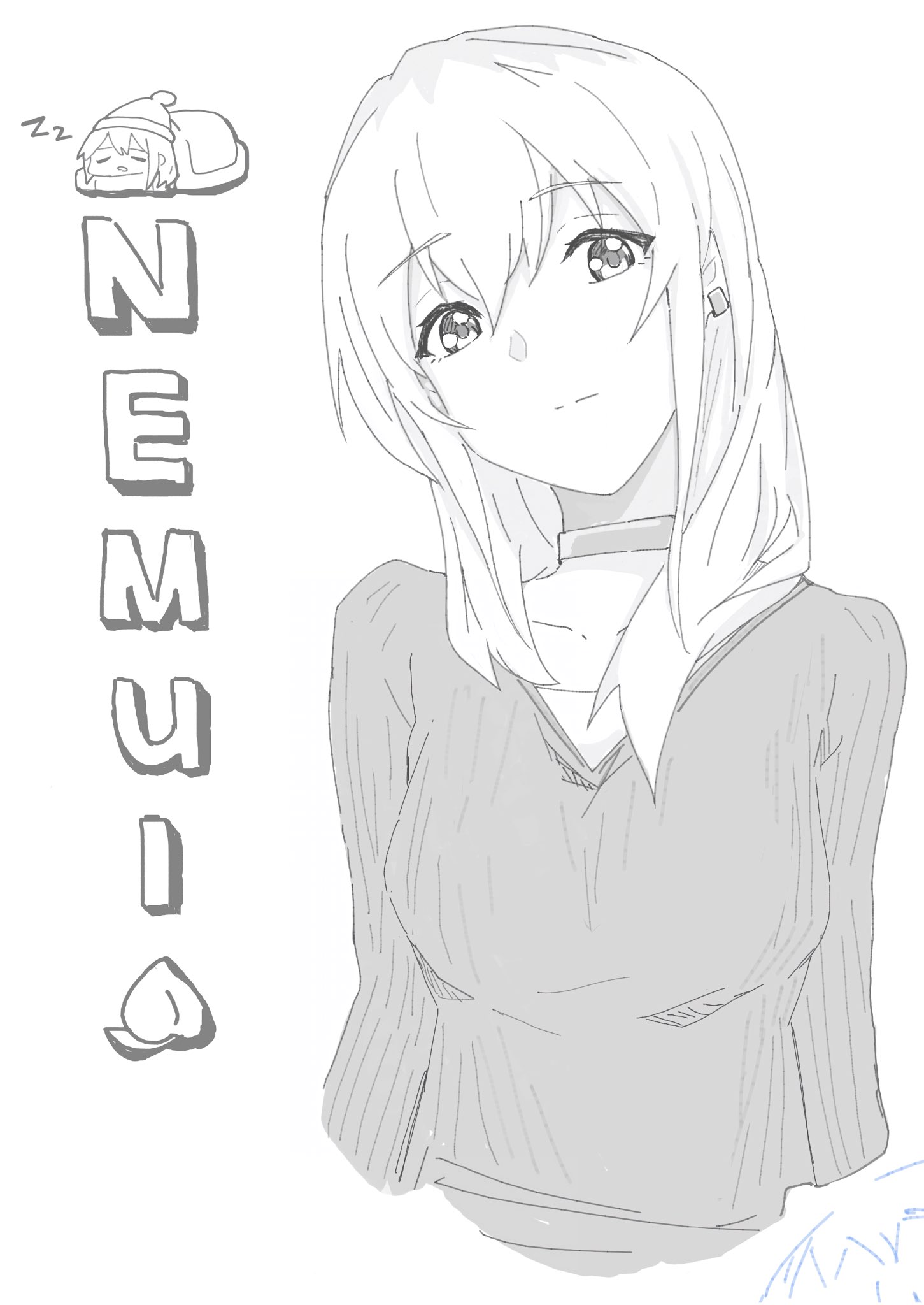 1girlbreastschokergreyscalehair between eyeshatlong hairlooking at viewermedium breastsmonochromemulticolored hairnightcapromaji textroots (hair)simple backgroundsweaterupper bodywhite background
