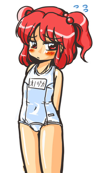 1girlaged downblushfemale focusflat chestname tagone-piece swimsuitred eyesred hairschool swimsuitsoloswimsuitwhite one-piece swimsuitwhite school swimsuit