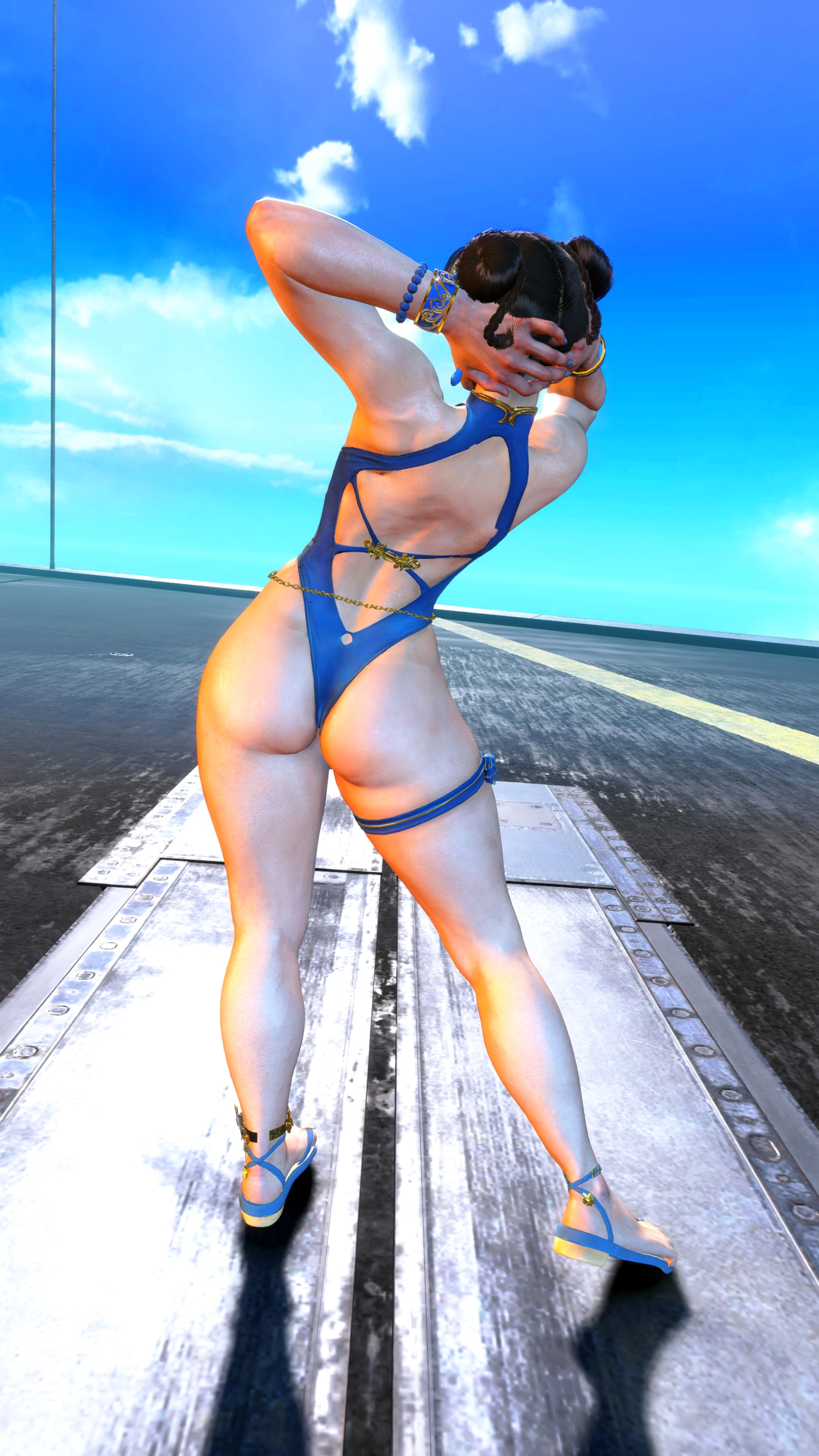 1girl3dalternate costumeassbackbare legsbare shouldersblue one-piece swimsuitbraceletbrown haircurvydouble bunhair bunhighleghighleg one-piece swimsuithuge assjewelryofficial alternate costumeone-piece swimsuitoutdoorsparted lipsryonashiny skinskindentationskysolostandingstretchingswimsuitthighletthong one-piece swimsuitwide hips