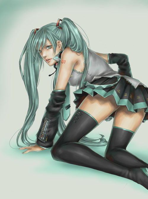 1girlall foursaqua hairbent overblack thighhighsbootsfemale focusfrom behindlipslong hairlooking backon floorparted lipspleated skirtrealisticsimple backgroundskirtsolothigh bootsthighhighstwintailszettai ryouiki