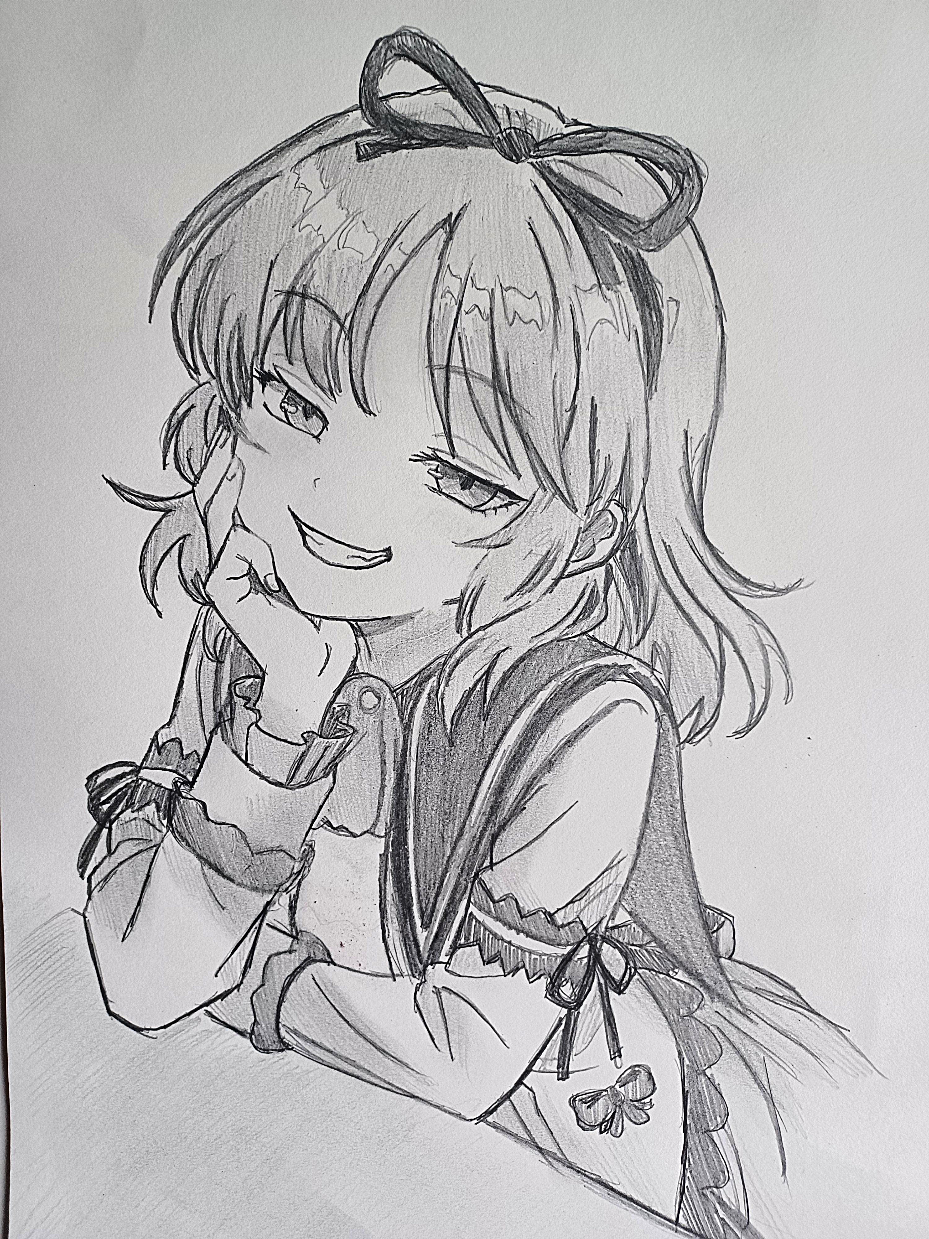 1girleyelashesgreyscalehair ribbonlooking at viewermonochromeribbonsittingsmilesmugsolotakuu (seadog6662)teeth