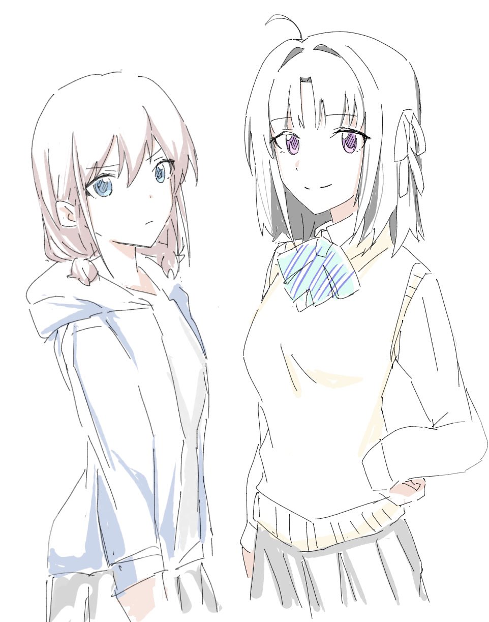 satou yuzuki, togawa sakiko, bang dream!, bang dream! it's mygo!!!!!, absurdres, highres, paid reward available, variant set, 1boy, 1girl, anime coloring, arrow (symbol), artist name, bar censor, bare legs, barefoot, bed sheet, biting own lip, black ribbon, blazer, blue background, blue bra, blue hair, blue panties, blush, bra, buttons, censored, center-flap bangs, clothed female nude male, clothed sex, cowgirl position, erection, furrowed brow, gradient background, green skirt, grey jacket, hair in own mouth, hair ribbon, hand on another's hand, hand on another's thigh, haneoka school uniform, hetero, jacket, lapels, leaning forward, long hair, long sidelocks, long sleeves, looking to the side, lying, microskirt, navel, no shirt, notched lapels, nude, official style, on bed, on side, panties, penis, plaid clothes, plaid skirt, pleated skirt, ribbon, scared, school uniform, sidelocks, signature, simple background, skirt, soles, spread legs, straddling, swept bangs, tearing up, tears, testicles, trembling, turning head, two side up, underwear, winter uniform, yellow eyes