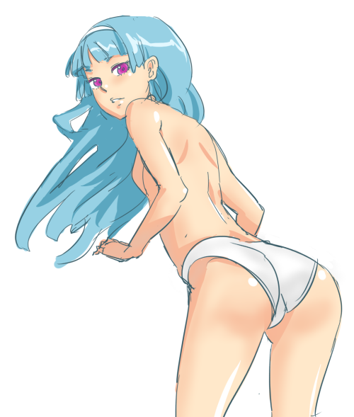 bzzch, fubuki (one-punch man), one-punch man, …, 1girl, ?, breasts, english text, female focus, green eyes, green hair, large breasts, medium hair, navel, nipples, pussy, removing panties, shiny skin, topless female, uncensored, wide hips
