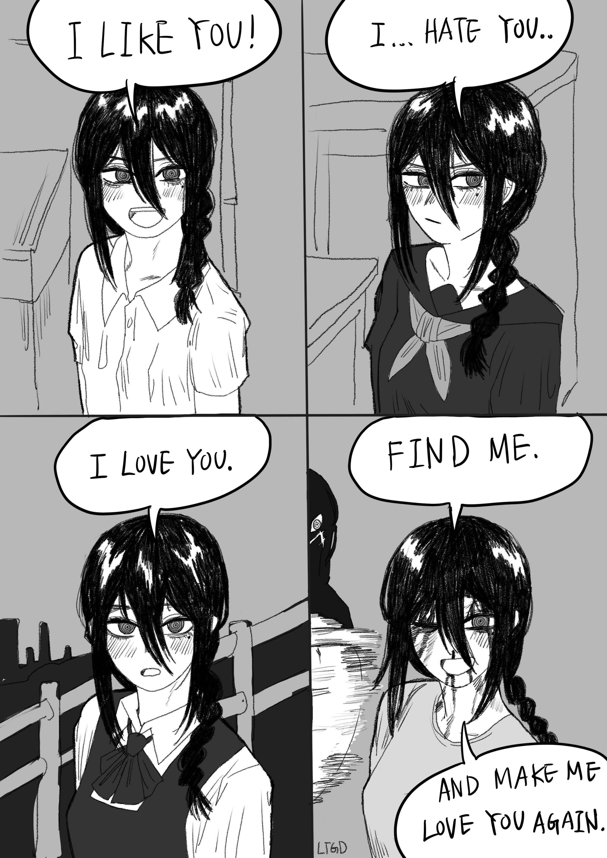 1boy1girl1otherage progressionaged upaverting eyesbloodblood from mouthblood on faceblushbraidbraided ponytaildated commentarydressenglish textgreyscalehair between eyeslctgd (gysw3723)long hair between eyesmolemole under eyemonochromeneckerchiefnosebleedpinafore dressrailingringed eyesschool uniformserafukusidelockssleevelesssleeveless dresssmilespeech bubble