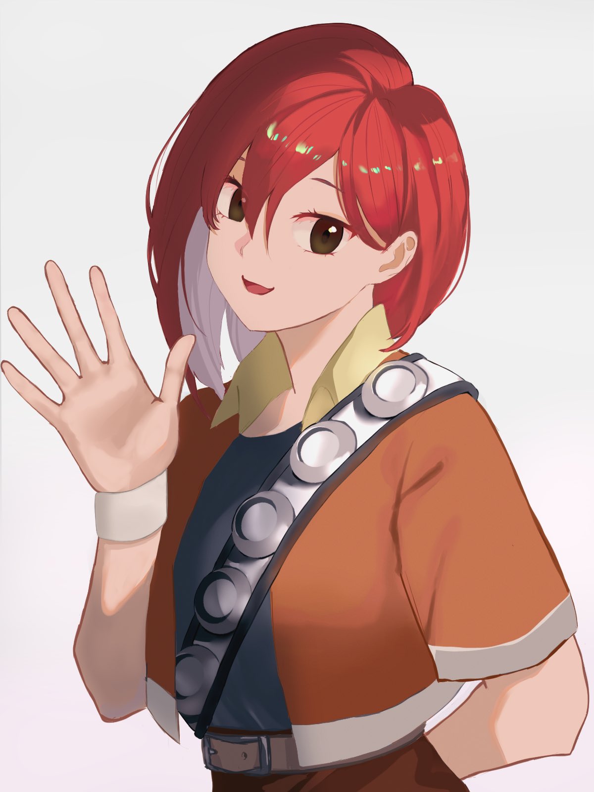 1girlbeltharuchika (spring 0 a)looking at vieweropen mouthred hairshort hairsimple backgroundsmilesolowavingwhite background