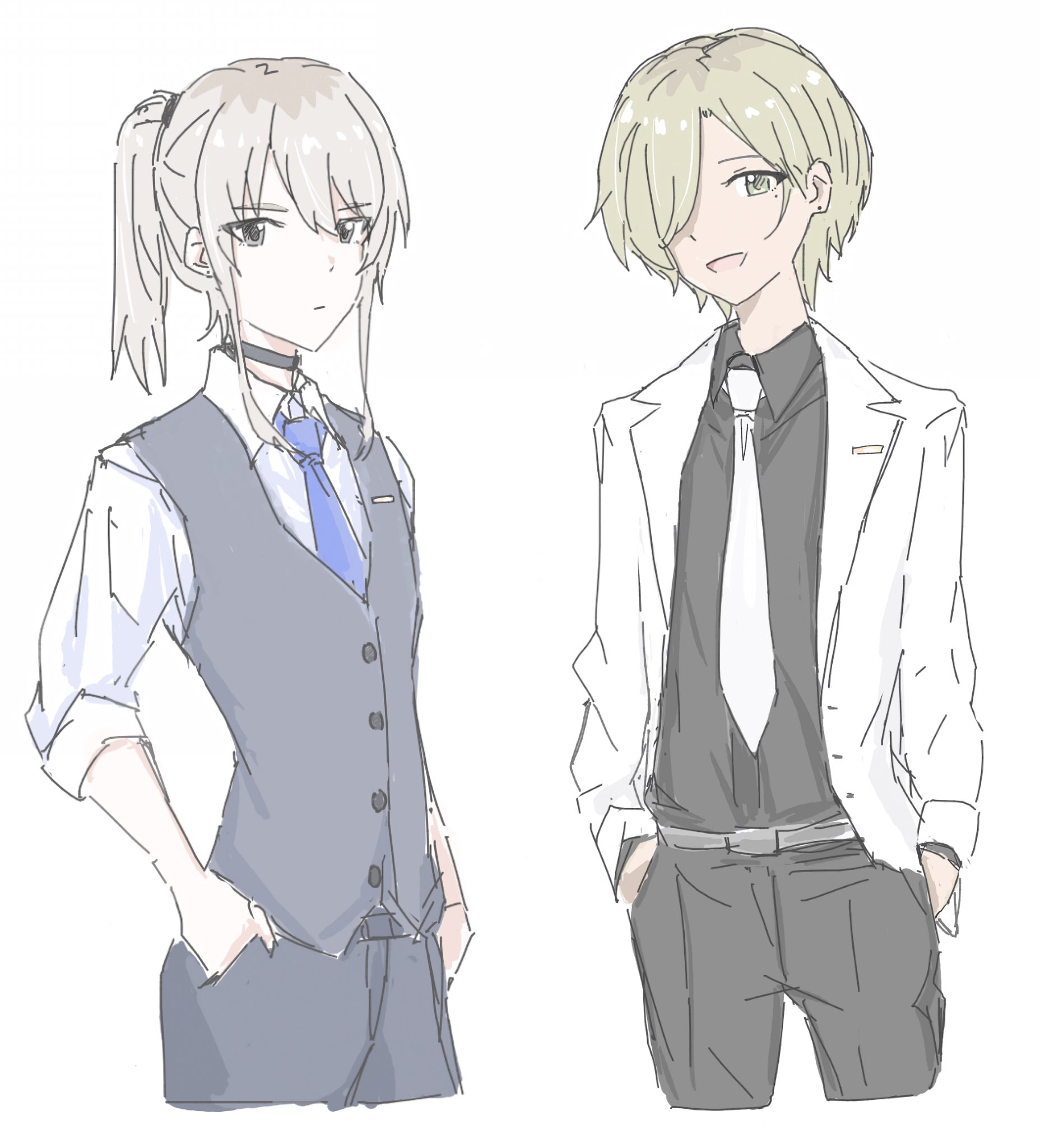 2girlsblack chokerblack pantsblack shirtblue necktieblue pantsblue vestbrown eyesbrown hairchokercollared shirtcowboy shotdress shirtgrey eyesgrey hairhair over one eyehands in pocketsjacketmedium hairmolemole under eyemulticolored hairmultiple girlsnecktieopen mouthpantsponytailroots (hair)shirtshort hairsidelockssimple backgroundthree-quarter sleevesvestwhite backgroundwhite jacketwhite necktiewhite shirt