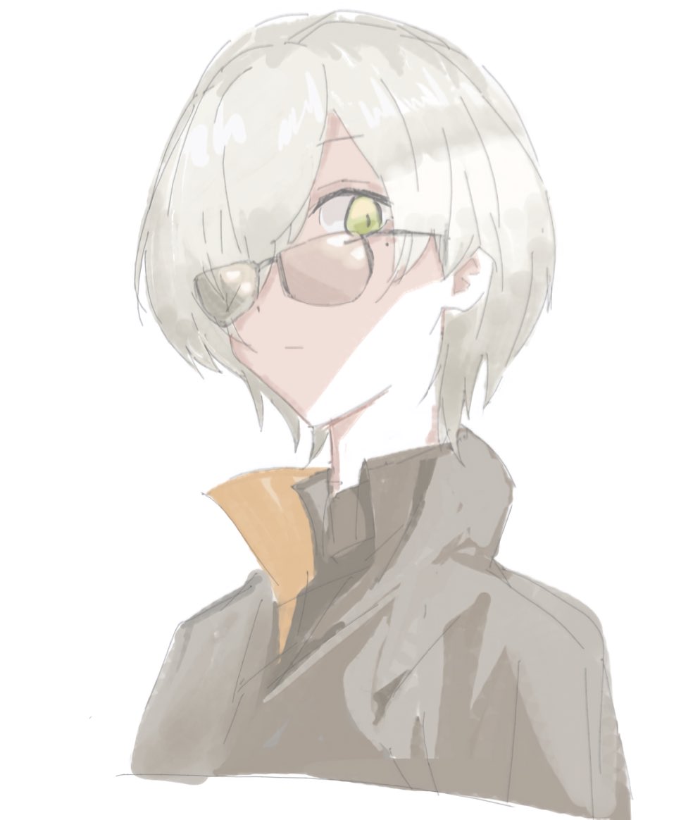 1girlblack jacketgreen eyesgrey hairhair over one eyejacketmolemole under eyemulticolored hairroots (hair)short hairsimple backgroundsolosunglassesupper bodywhite background