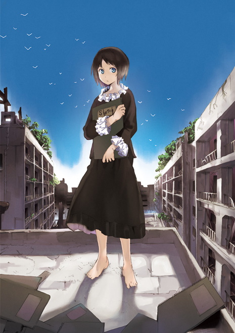 1girlbacklightingbarefootbirdblack hairblack shirtblack skirtblue eyesblue skybuildingcitycollardayfeetfemale focusfrilled collarfrilled sleevesfrillsfull bodyholdinglong sleeveslooking at viewerno shoesparted bangsplantrooftopruinsshirtshort hairsketchbookskirtskysolostandingtoes