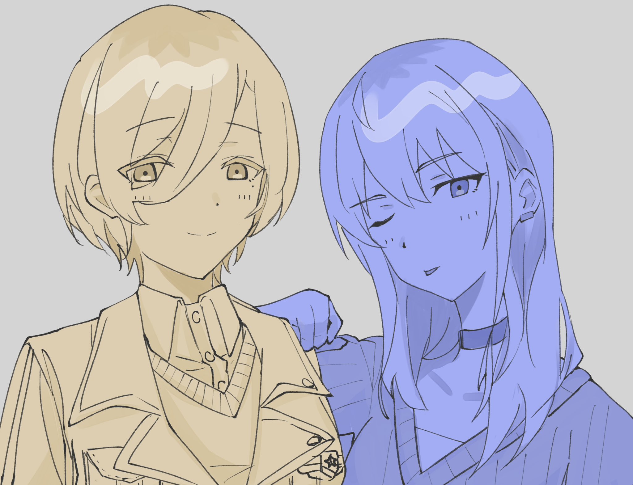 2girlschokerearclipgrey backgroundhair between eyeshand on another's shoulderjacketlong hairlong hair between eyesmolemole under eyemultiple girlsmultiple monochromeone eye closedshort hairsidelockssimple backgroundsweatertonguetongue outupper body