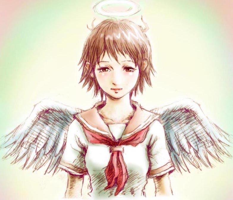 00sangel wingsbrown eyesbrown hairhalomessy hairschool uniformshort hairsketchsolotraditional halowings