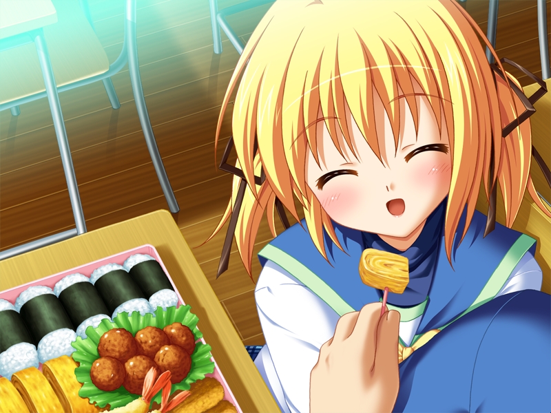 1boy1girlblonde hairclosed eyesfeedingfemale focusfoodmeatballpov feedingschool uniformshort hairsolosushitwintails
