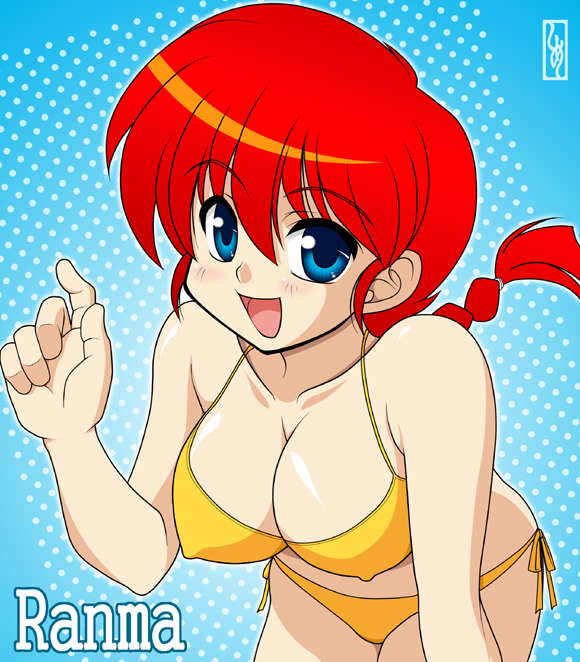 1girlbikiniblue eyesbraidbraided ponytailbreastscharacter namecleavagecovered erect nipplescowboy shotfemale focusgenderswapgenderswap (mtf)large breastsopen mouthpolka dotpolka dot backgroundred hairsingle braidsoloswimsuityellow bikini