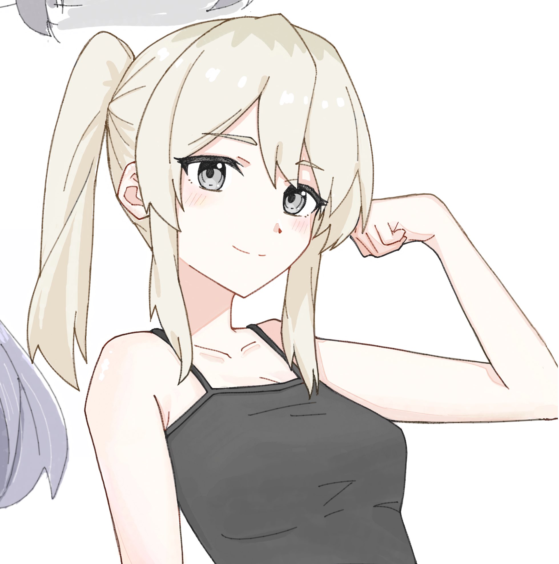 1girlarm upblack camisoleblushbreastscamisoleclosed mouthcolored skingrey eyesgrey hairlong hairlooking at viewermedium breastsmulticolored hairponytailroots (hair)sidelockssolospaghetti strapupper bodywhite background