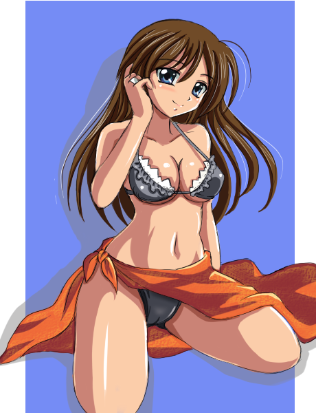 1girlbikiniblue backgroundblue eyesbrown hairfemale focusjewelrylong hairringsarongsoloswimsuit