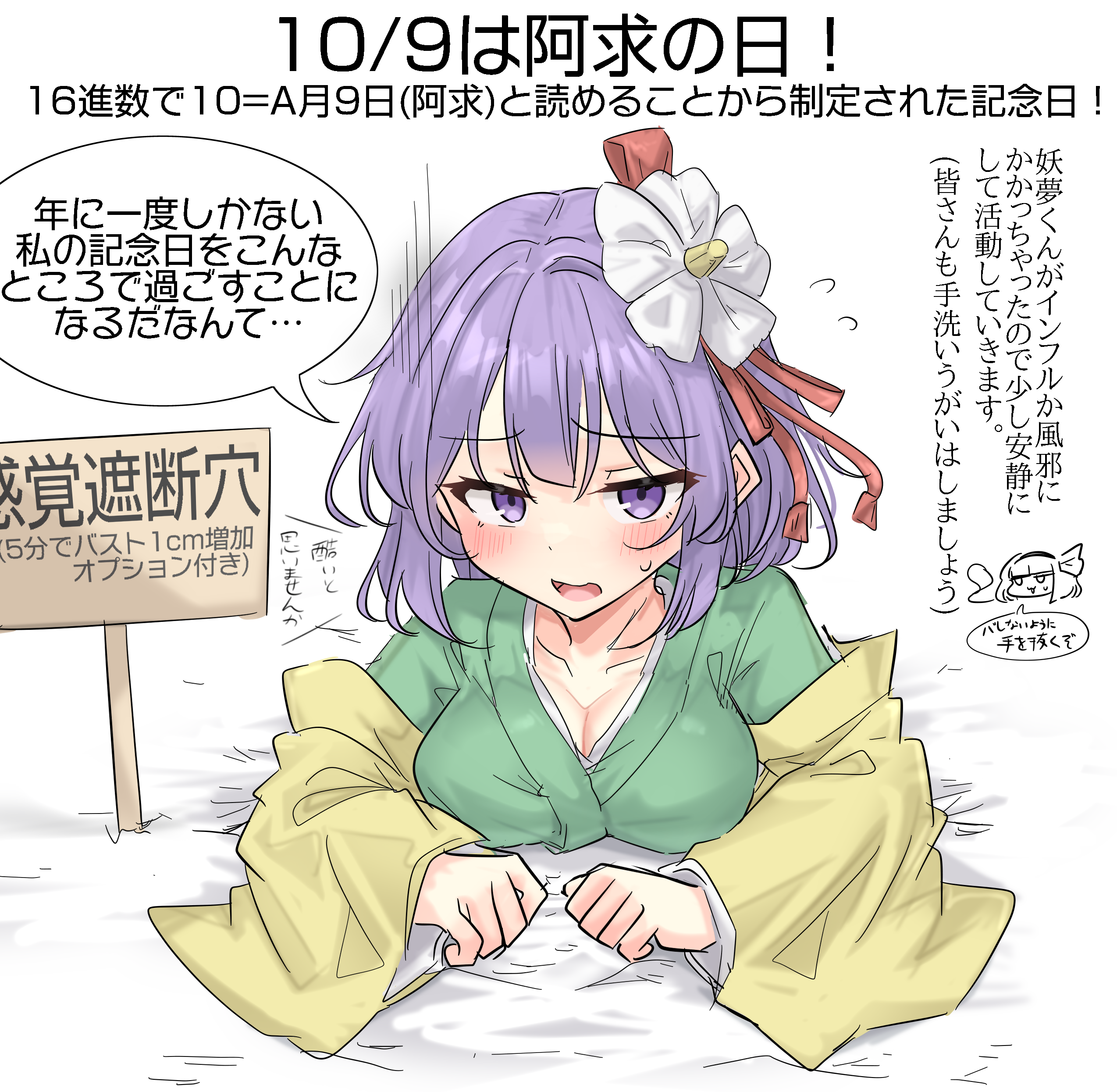 2girlsblushbreastscleavageflowergreen kimonogrey eyeshair flowerhair ornamentjapanese clotheskankaku shadankimonolooking at viewermedium breastsmultiple girlsopen mouthpurple eyespurple hairshort hairspeech bubblewhite backgroundwhite flower