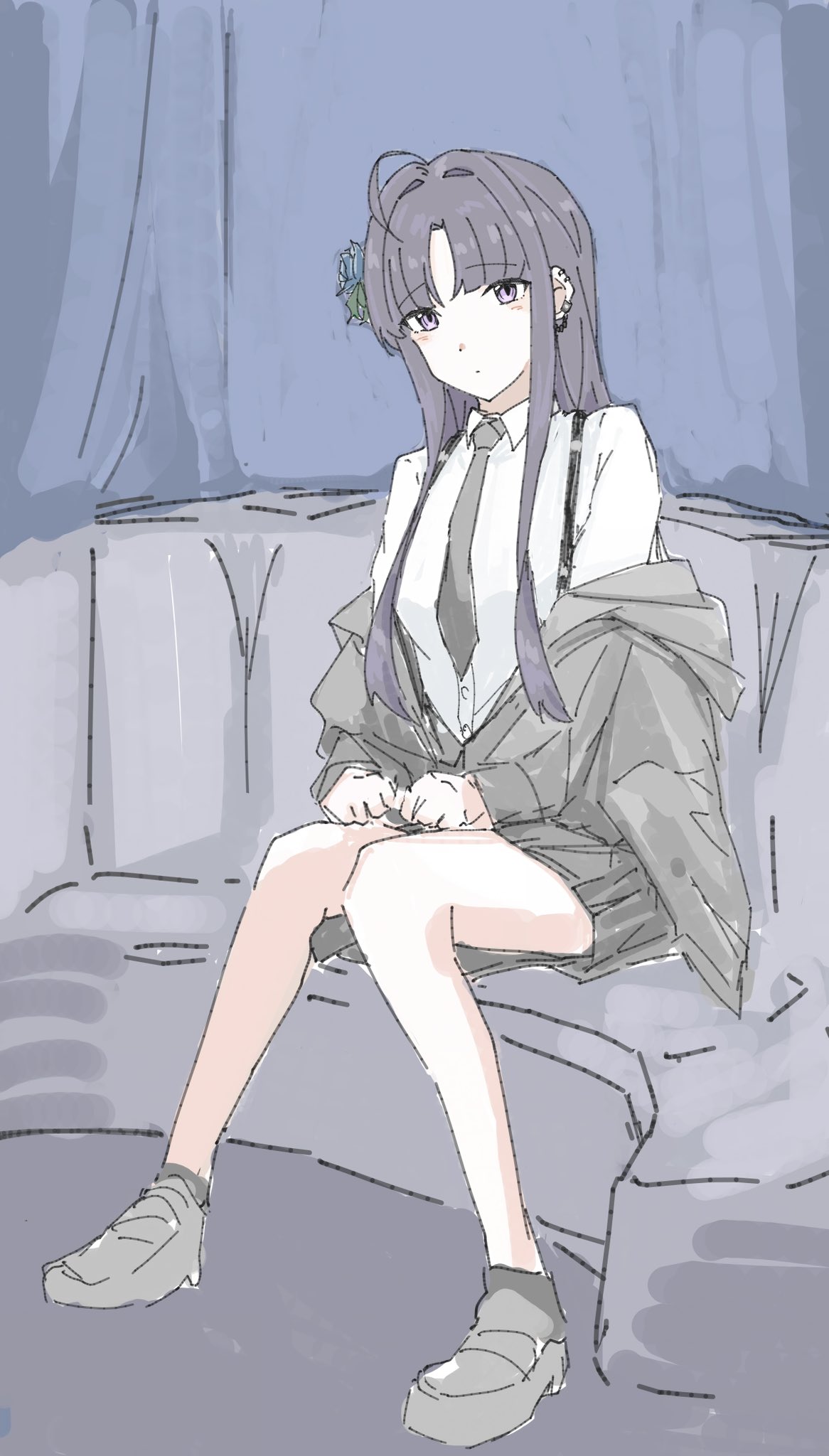 1girlahogeblack hairblack necktieblack skirtclosed mouthear piercingflowergrey jacketgrey shoeshair flowerhair ornamentjacketlong hairnecktieoff shoulderparted bangspiercingpurple eyesshirtshoessidelockssittingskirtsolosuspenderswhite shirt