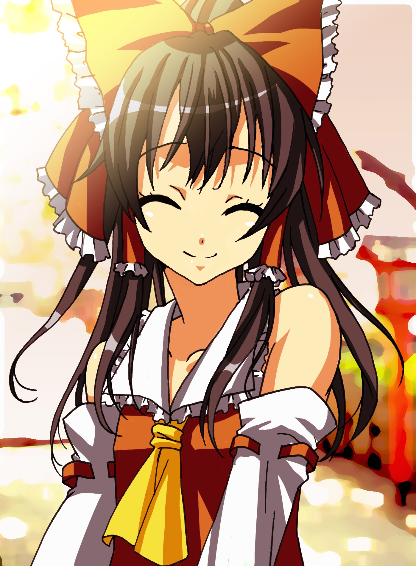 1girlbare shouldersbowbrown hairclosed eyesdetached sleevesfemale focusflat chesthair bowhair tubeshappyjapanese clotheslarge bowmikoribbonsmilesolosunlighttoriiupper body