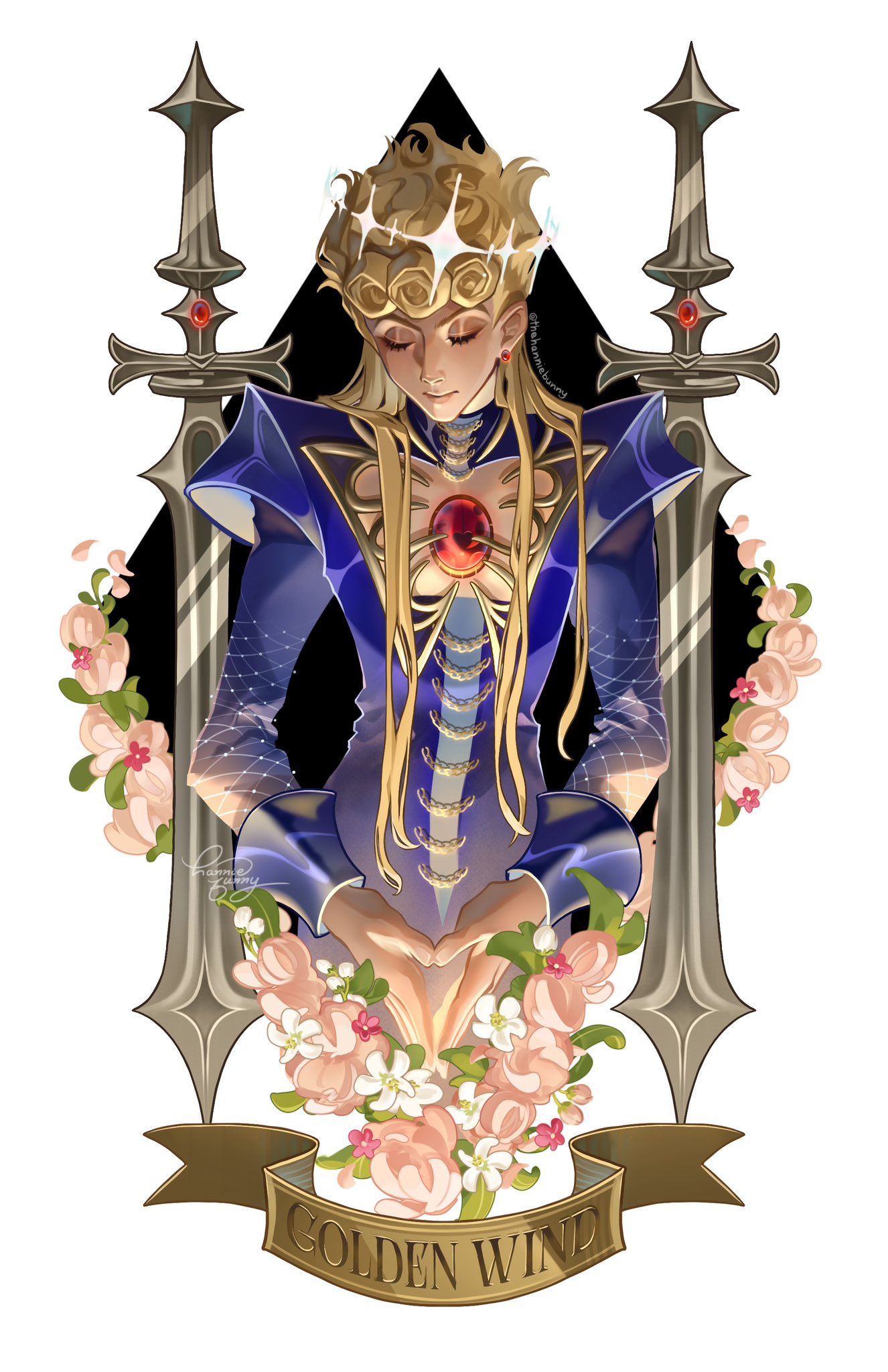 1boyalternate costumealternate hairstyleblonde hairbraidcleavage cutoutclosed eyesclosed mouthclothing cutoutcrownearringsenglish textflowerhair downjewelryladybug ornamentlong hairlong sleevesmale focusown hands togetherpink flowersimple backgroundsmilesoloswordupper bodyweaponwhite backgroundwhite flower