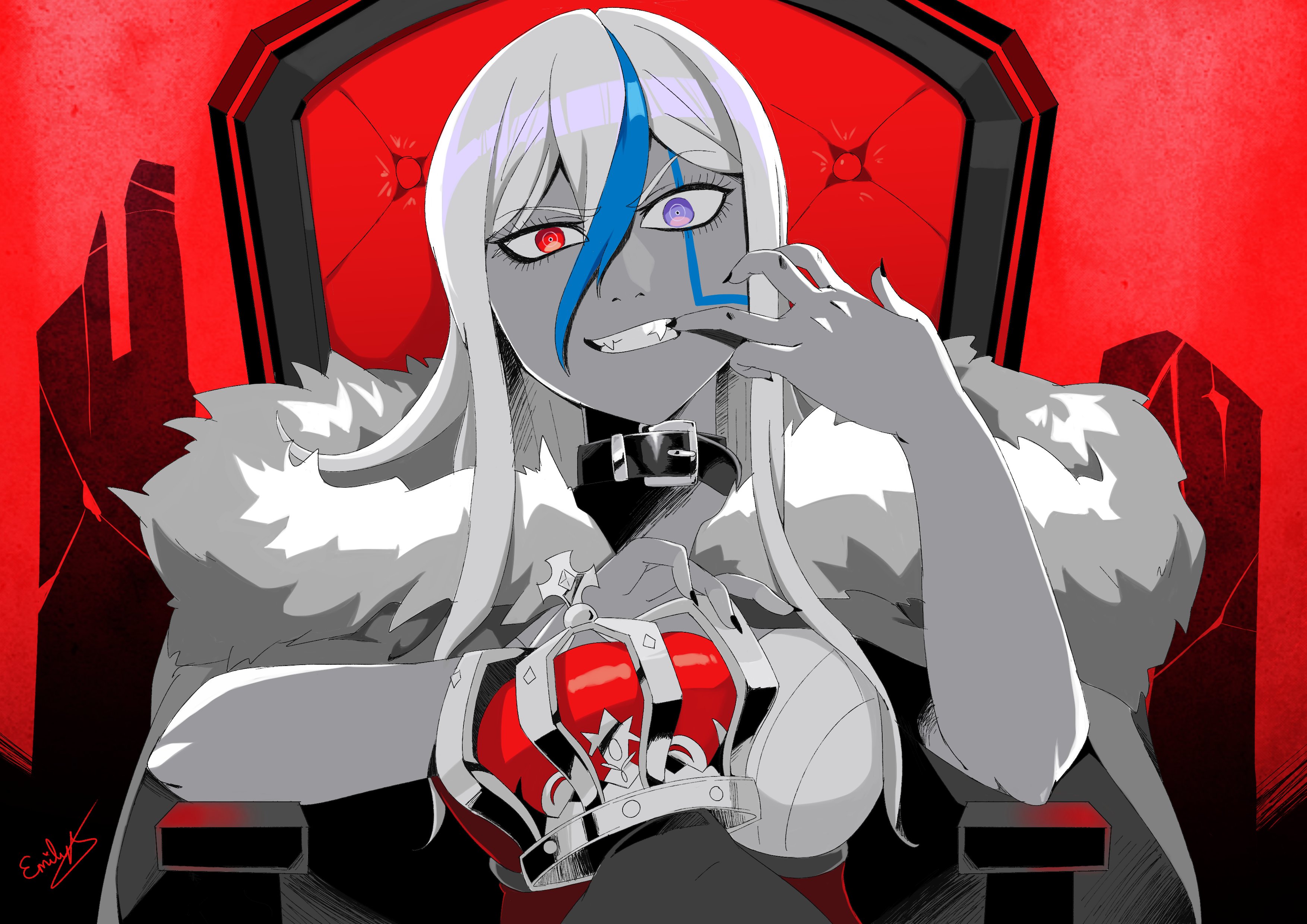 stachewaffle, caulifla, seripa, dragon ball, dragon ball super, copyright request, highres, 1girl, black vest, blonde hair, boots, collarbone, cosplay, crossed legs, dragon ball gekishin squadra, gloves, green eyes, hand on own hip, hand up, invisible chair, knee pads, leotard, looking at viewer, looking to the side, muscular, muscular female, pink leotard, saiyan armor, seripa (cosplay), simple background, sitting, smile, socks, super saiyan, super saiyan 2, thighhighs, vest, white background, white boots, white gloves, yellow socks, yellow thighhighs
