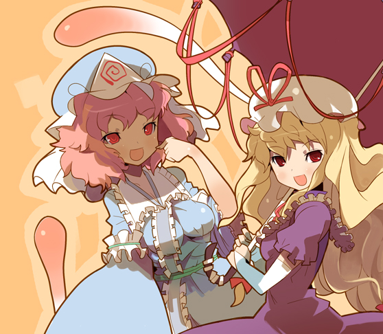 :d2girlsbreastselbow glovesfemale focusgloveshatjapanese clotheskimonolarge breastslooking at viewermob capmultiple girlsopen mouthpink eyespink hairpuffy short sleevespuffy sleevespurple eyesshort sleevessmiletriangular headpieceumbrellawhite gloves