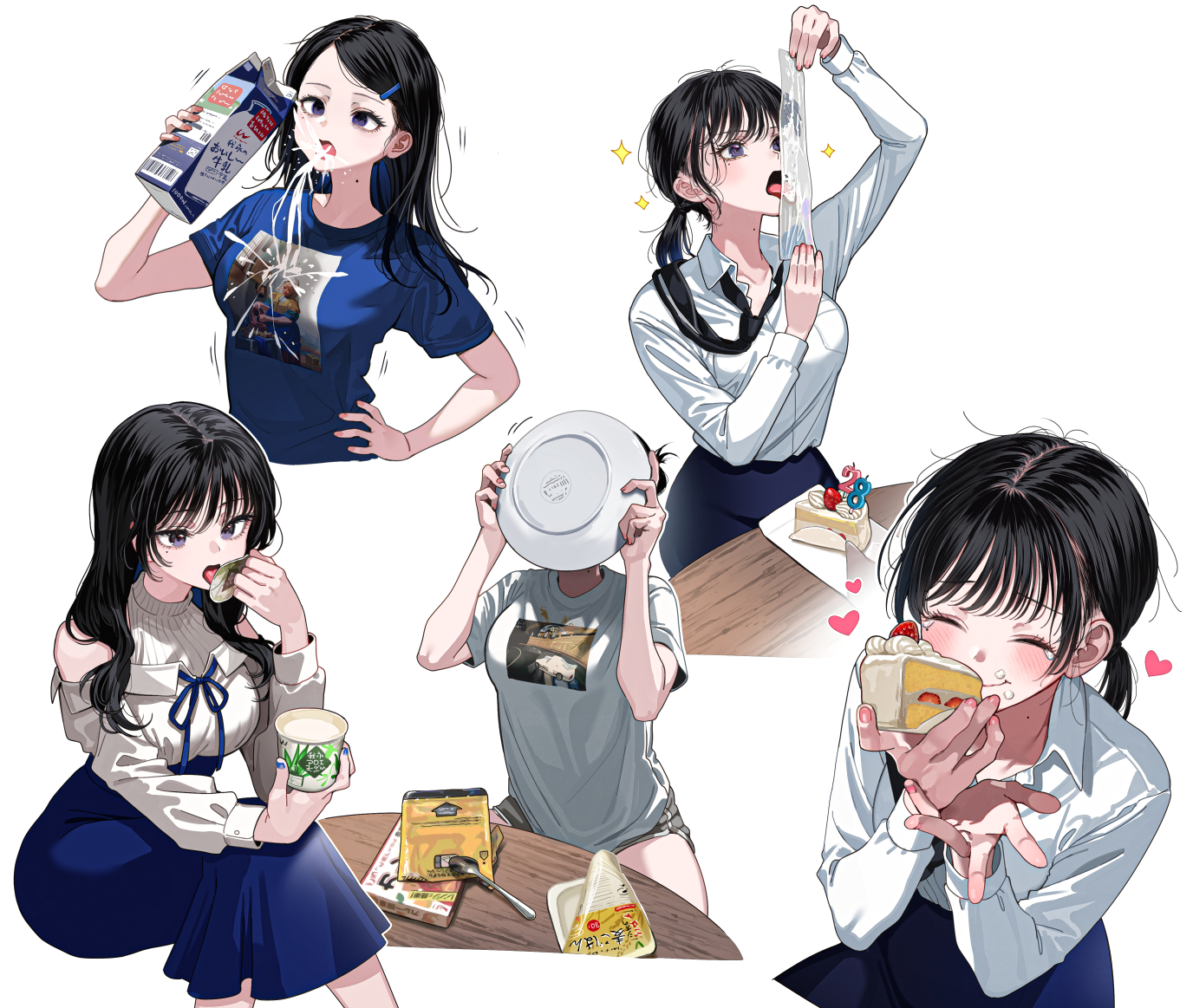black hairblue skirtblushcakeeatingfoodhair ornamenthairclipheartmilkplateponytailshirtskirtsmilespoontabletearstonguetongue outwhite shirt