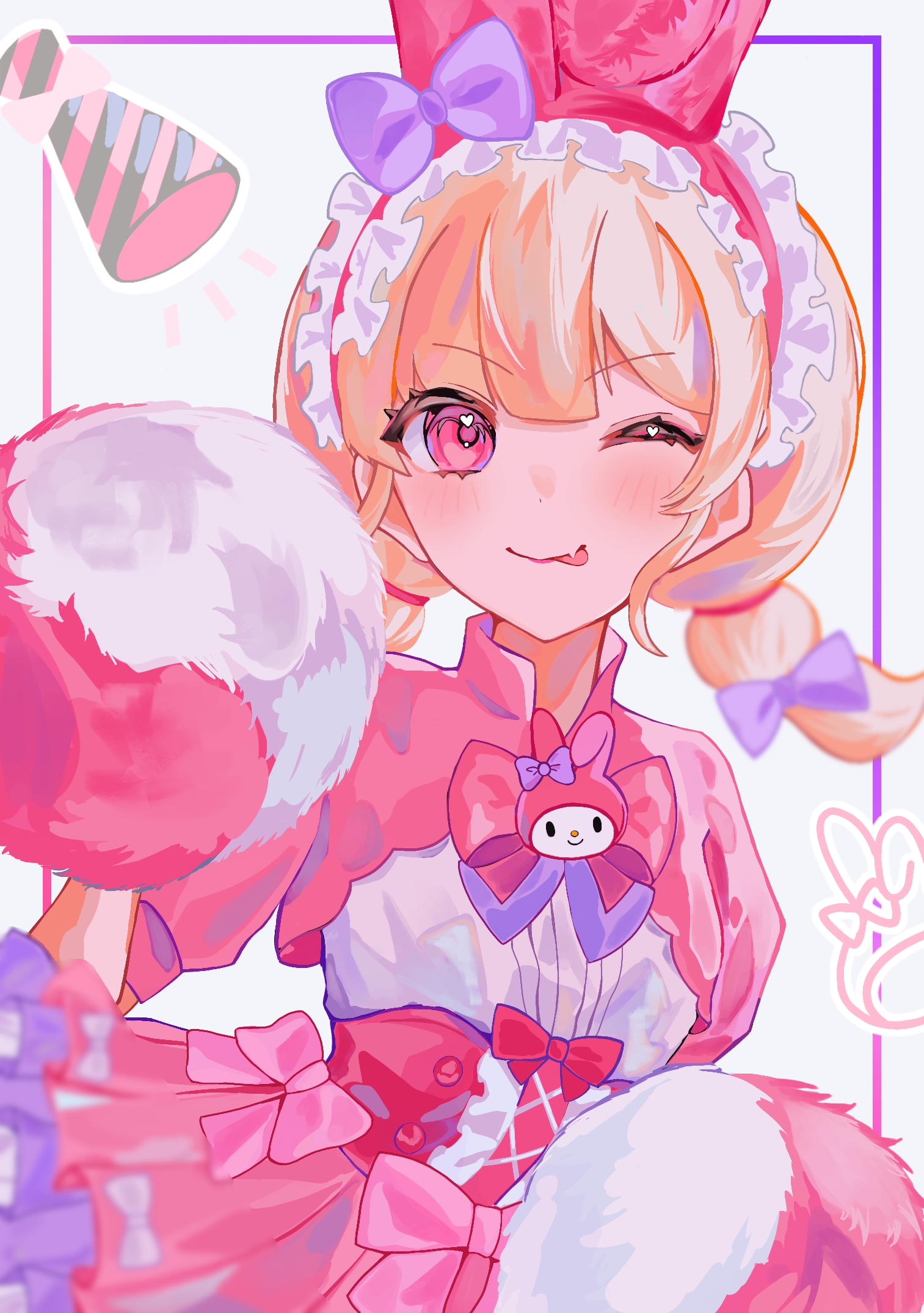 :panimal ear hairbandanimal earsblonde hairblunt bangsblushbowcorsetcropped jacketfake animal earsfangfrilled hairbandfrillshairbandhigh collarjacketmatatabi 224one eye closedpink bowpink corsetpink eyespink hairbandpink jacketpink skirtpom pom (cheerleading)purple bowrabbit ear hairbandrabbit earsshirtshort twintailsskin fangskirttonguetongue outtwintailswhite shirt