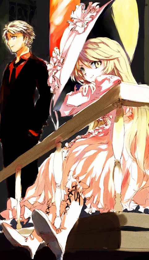 blonde hairbootscrossed armsdressfrillshand in pockethatlace-up bootsnecktieopen collarpink themerailingyellow eyes