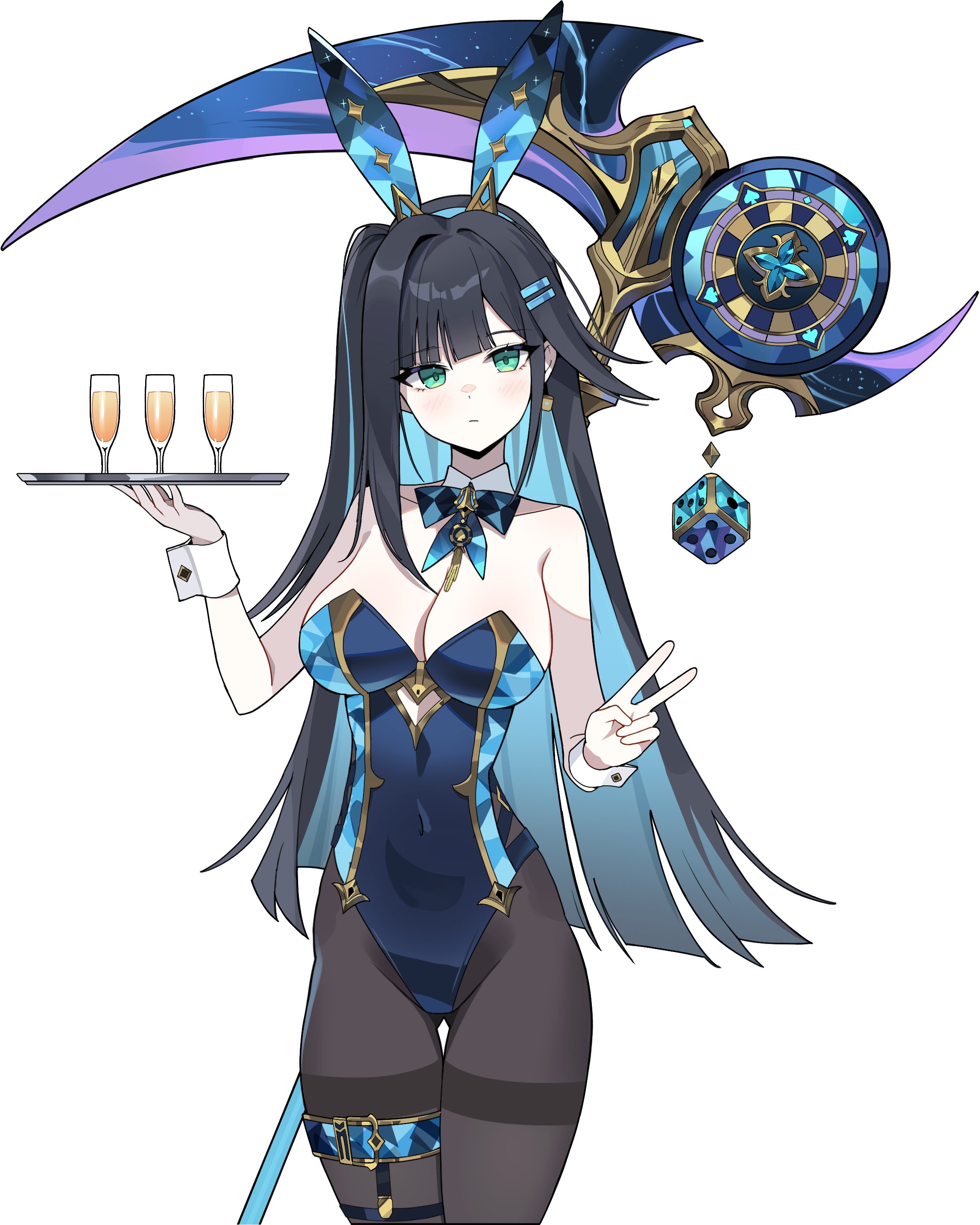 1girlabigail (poker face) (black survival)alcoholanimal earsbare armsbare shouldersbeltblack hairblack leotardblue bowblue hairblue hairbandblue leotardbowbreastschampagneclosed mouthclothing cutoutcolored inner haircupcutout above naveldicefake animal earsgold trimgreen eyeshair intakeshair ornamenthairbandhaircliphand uphighleghighleg leotardholdingholding scythelarge breastsleotardlong hairlooking at viewermulticolored hairofficial alternate costumepantyhoseplayboy bunnyscythethigh gapv