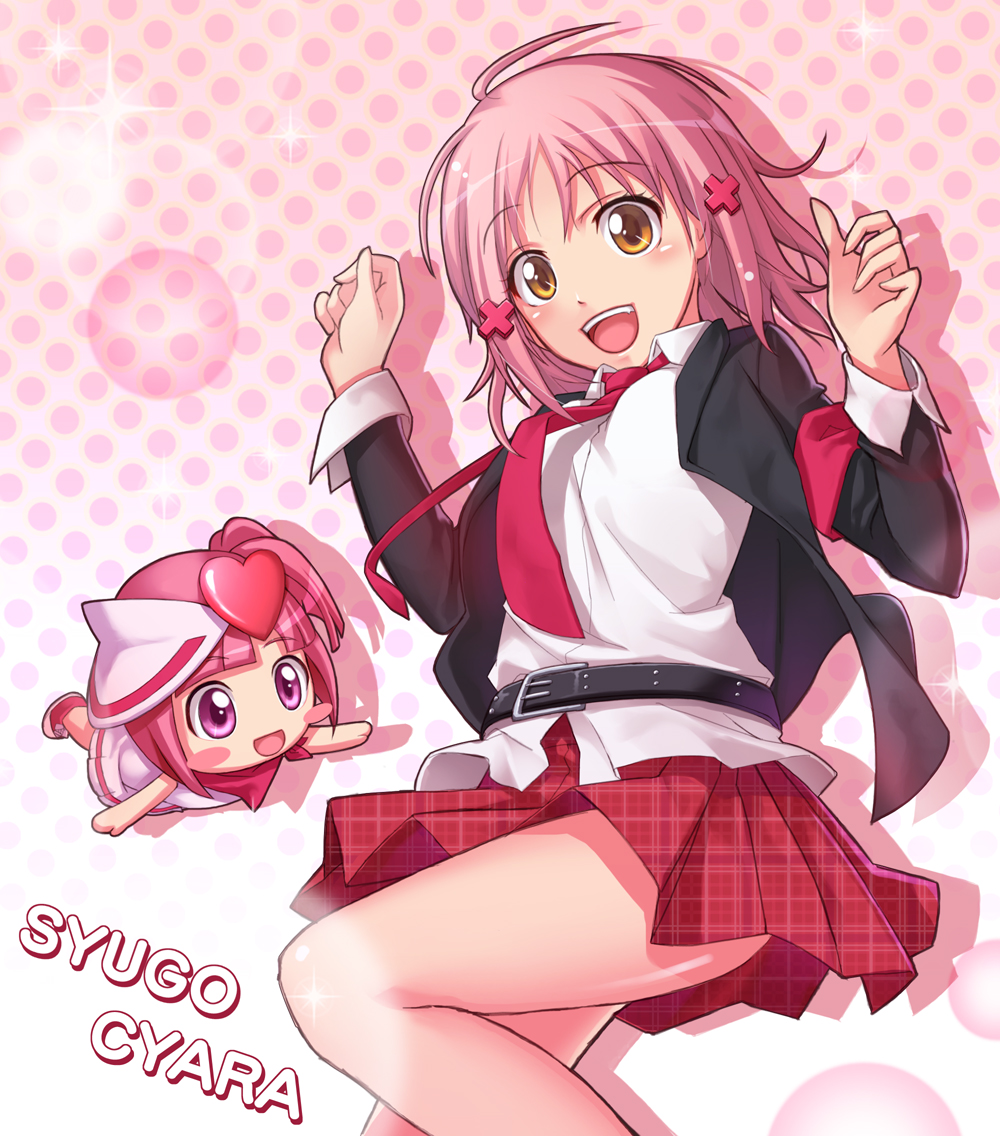 2girlsbeltcross hair ornamentguardian charahair ornamentheartmultiple girlsnecktiepink eyespink hairplaid clothesplaid skirtschool uniformshort hairskirtvisor capyellow eyes