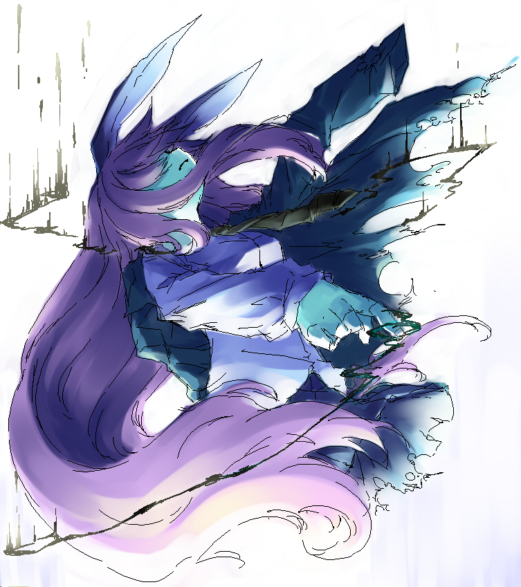1girlanimal earsblack necktieblue skincapeclosed mouthcollared shirtcolored skinfemale focusfrownhair over eyesjacketlong hairlong sleevesnecktieoutstretched armpointingpurple hairrabbit earsshirtskirtsolotorn capetorn clothestorn skirtupper bodyvery long hairwhite shirt
