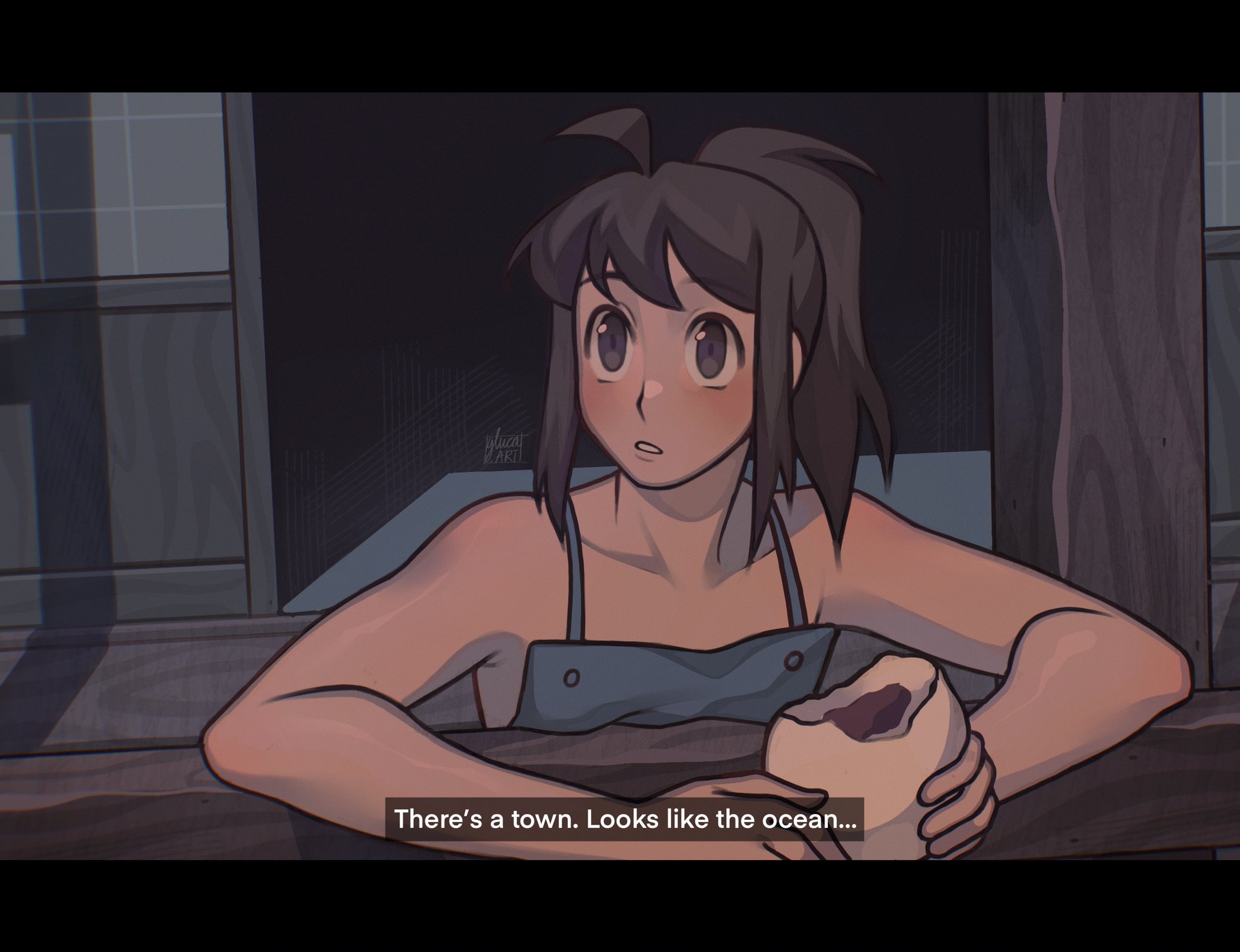 1girlahogeapronblue aprondumplingenglish textflat chestfoodholdingholding foodletterboxedponytailshoujisignaturesliding doorssolosubtitledupper body