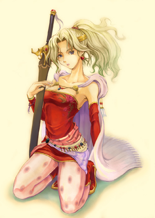 1990s (style)1girlblonde hairblue eyescapedetached sleevesearringsfemale focusjewelrykneelinglong hairnail polishpantyhosepatterned legwearpink nailspink pantyhoseponytailprint pantyhoseretro artstylesoloswordweapon