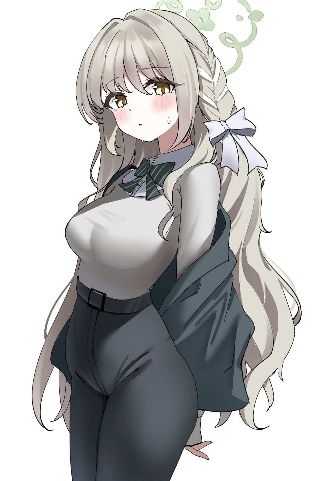 :o1girlblack pantsblushbowbowtiebraidbreastsdiagonal-striped bowdiagonal-striped bowtiediagonal-striped clothesgreen bowgreen bowtiegreen jacketgrey hairgrey sweaterhair bowhair intakeshair ribbonhalohigh-waist pantsjacketjacket partially removedlong hairlooking at viewermedium breastspantsribbonribbon braidshirtsimple backgroundsolostriped bowstriped bowtiestriped clothessweatsweatervery long hairwhite backgroundwhite bowwhite ribbonwhite shirt