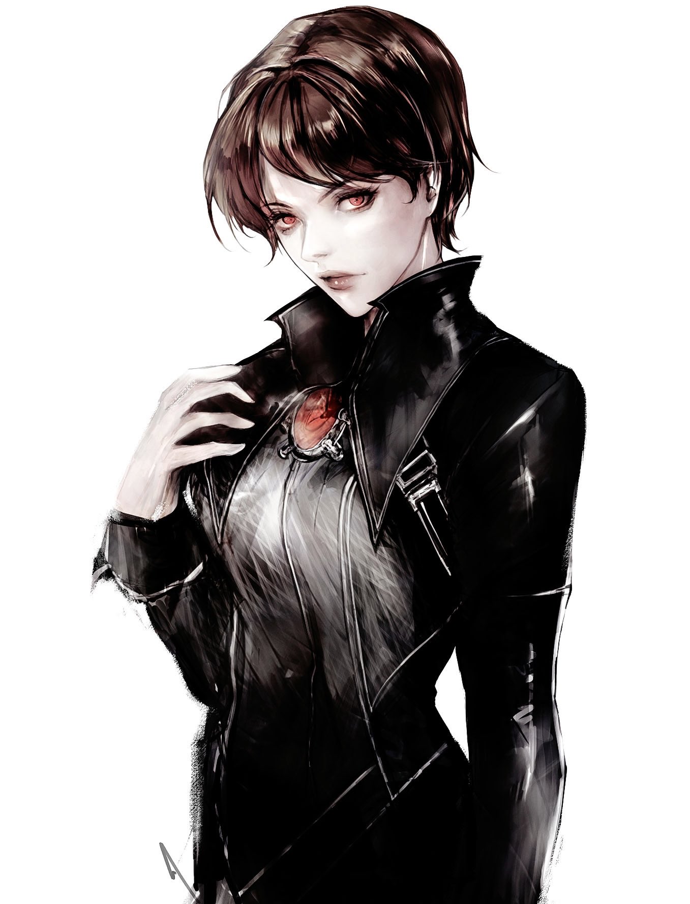 1girlblack coatbrown hairclosed mouthcoatgempale skinred eyesred gemstoneshort hairsimple backgroundsolostandingwhite background