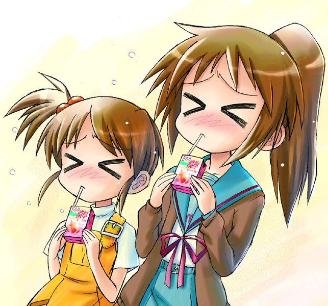 1boy2girlsblushclosed eyesdressdrinkinggenderswapjuice boxmultiple girlsparodypinafore dressponytailsiblingsside ponytailsisterssleevelesssleeveless dressyellow background