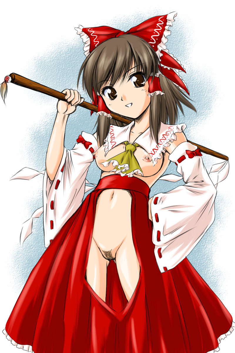 1girladapted costumebreastsbrown hairclothing cutoutcrotch cutoutdetached sleevesfemale focusfemale pubic hairgoheihair tubesjapanese clotheslong hairmedium breastsmikono brano pantiesparodypubic hairpussyrevealing clothessolostyle parodytorn clothesuncensored