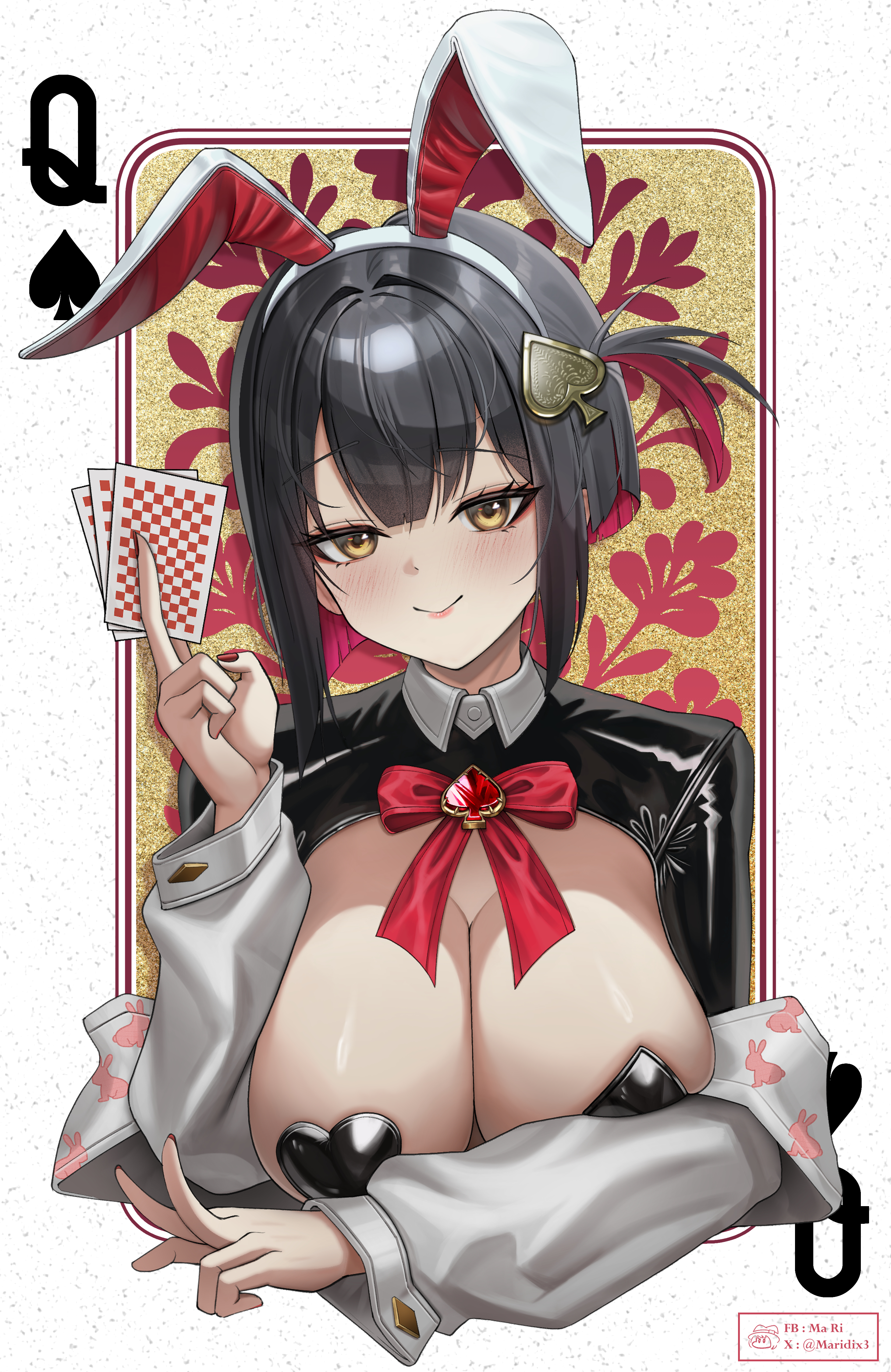 1girlanimal ear hairbandanimal earsanimal printblack hairblack shrugblushbowbreastscardclosed mouthcolored inner hairfacebook usernamefake animal earsfrontless outfithair between eyeshair ornamenthairbandholdingholding cardlarge breastslatex shruglooking at viewermismatched pastiesmulticolored hairoff shoulderofficial alternate costumeone side upopen clothesopen shirtpastiesplayboy bunnyplaying cardqueen (playing card)queen of spades (playing card)rabbit ear hairbandrabbit earsrabbit printred bowred hairreverse bunnysuitreverse outfitshirtshort hairshrug (clothing)sidelockssmilesolospade broochspade hair ornamentspade pastiestwitter usernameupper bodywhite shirtyellow eyes