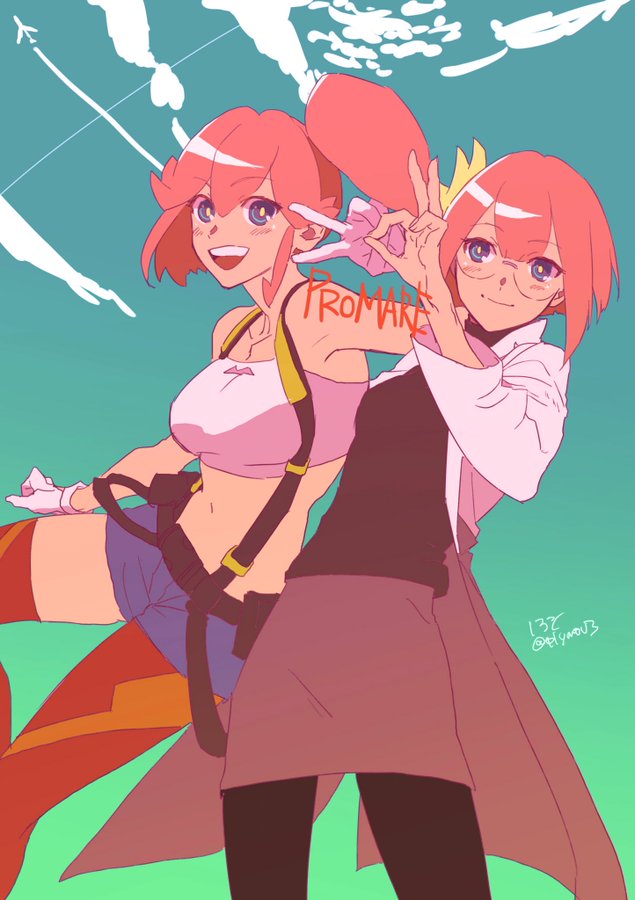 2girlsasymmetrical legwearblue shortsbright pupilsbrown skirtclosed mouthcoatcopyright nameglassesglovesgradient skylab coatmidriffmultiple girlsnavelopen mouthpencil skirtpink hairround eyewearshirtshort hairshort shortsshortssiblingsside ponytailsingle leg pantyhosesingle thighhighsistersskirtskysmilestraplesssuspendersthighhighstube topvwhite coatwhite gloveswhite pupilswhite shirt