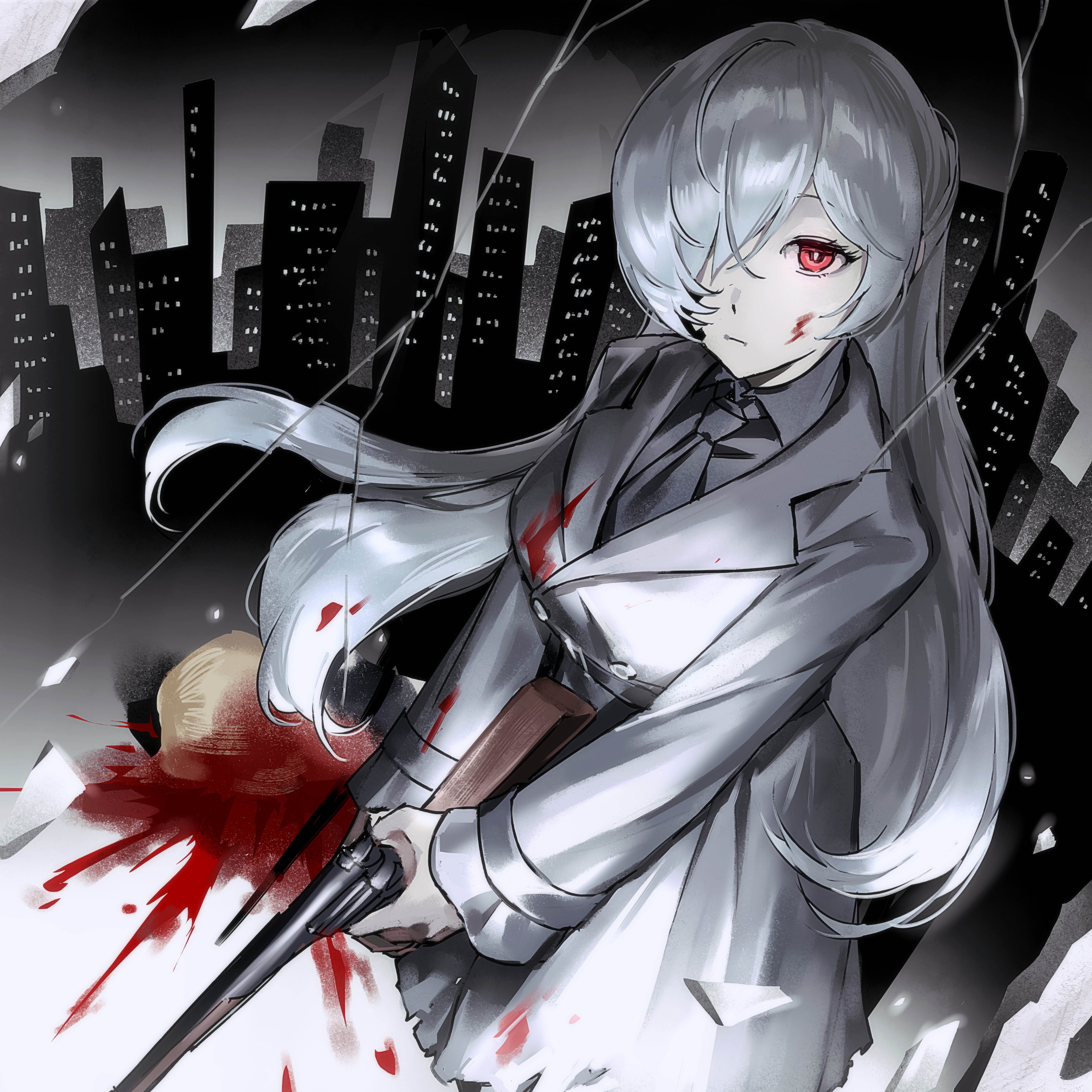 inkerton-kun, bury pink gril, 4chan, blue hair, border, colored skin, green eyes, hair ornament, hair ribbon, looking down, red background, red ribbon, ribbon, swirl, white border