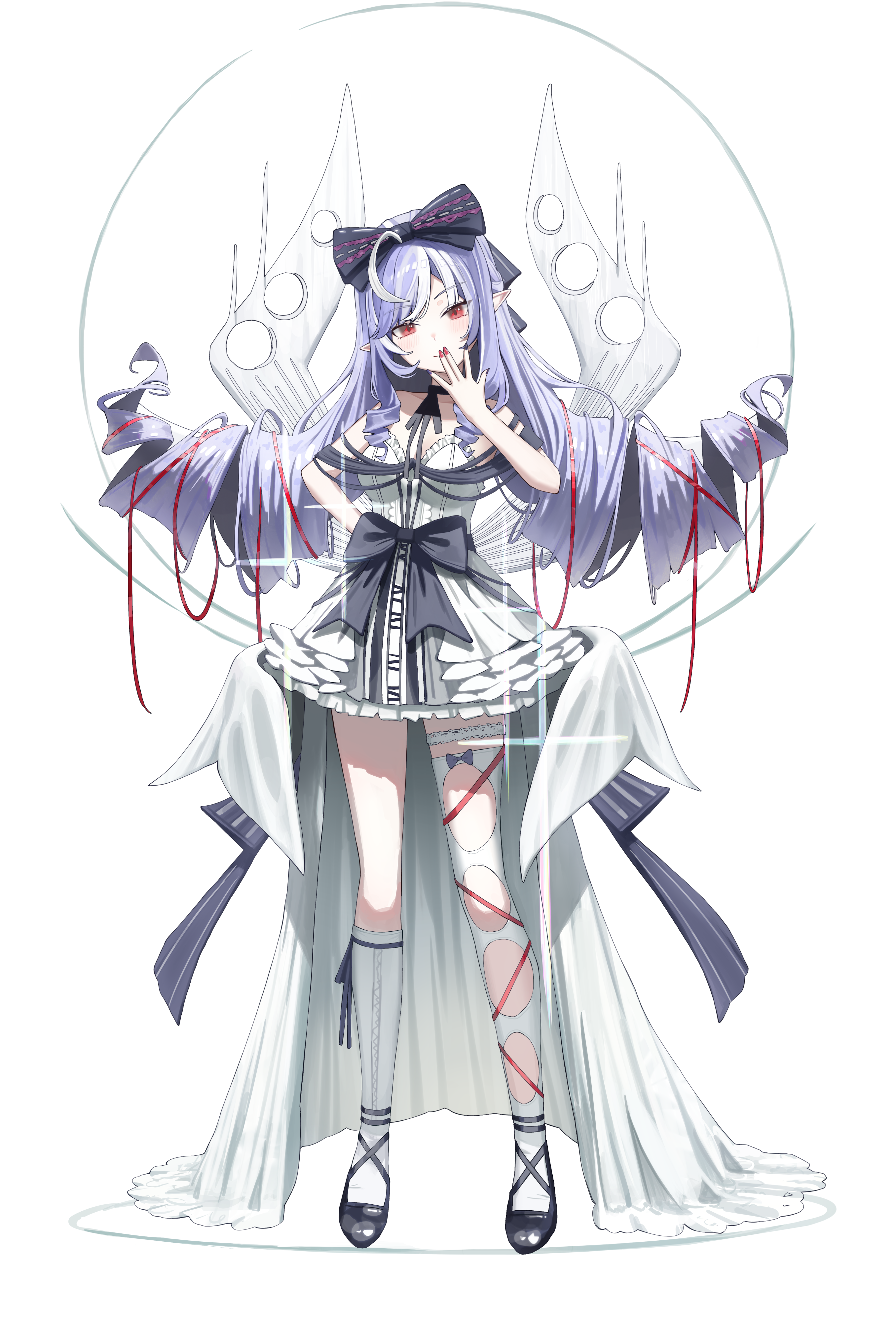 1girlalternate costumebare shouldersblack bowblack shoesblushbowbreastsclosed mouthcollarbonedressdrill hairfinger to mouthfingernailsfull bodyhair bowhand upkneehighslong hairlooking at viewermedium breastsmulticolored nailsnail polishpointy earspurple hairpurple nailsred eyesred nailsshoessimple backgroundsingle kneehighsingle socksingle thighhighsockssolostandingstraplessstrapless dressthigh strapthighhighsvery long hairwhite backgroundwhite dresswhite sockswhite thighhighs