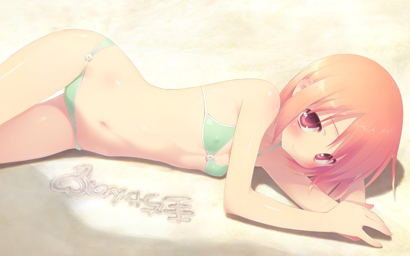 beachbikiniblushflat chestlolilyingmidriffnavelnipplesorange hairred eyesshort hairswimsuitthigh gapthighs