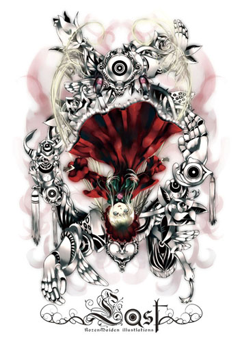 ellen joe, zenless zone zero, 1girl, black dress, black hair, black pantyhose, breasts, colored inner hair, cowboy shot, dress, fins, fish tail, frilled wristband, from side, lidd, looking at viewer, maid, maid headdress, mole, mole on arm, mole under eye, multicolored hair, pantyhose, parted lips, puffy short sleeves, puffy sleeves, razor blade hair ornament, red eyes, red hair, shark girl, shark tail, short dress, short hair, short sleeves, solo, tail, watermark, white background