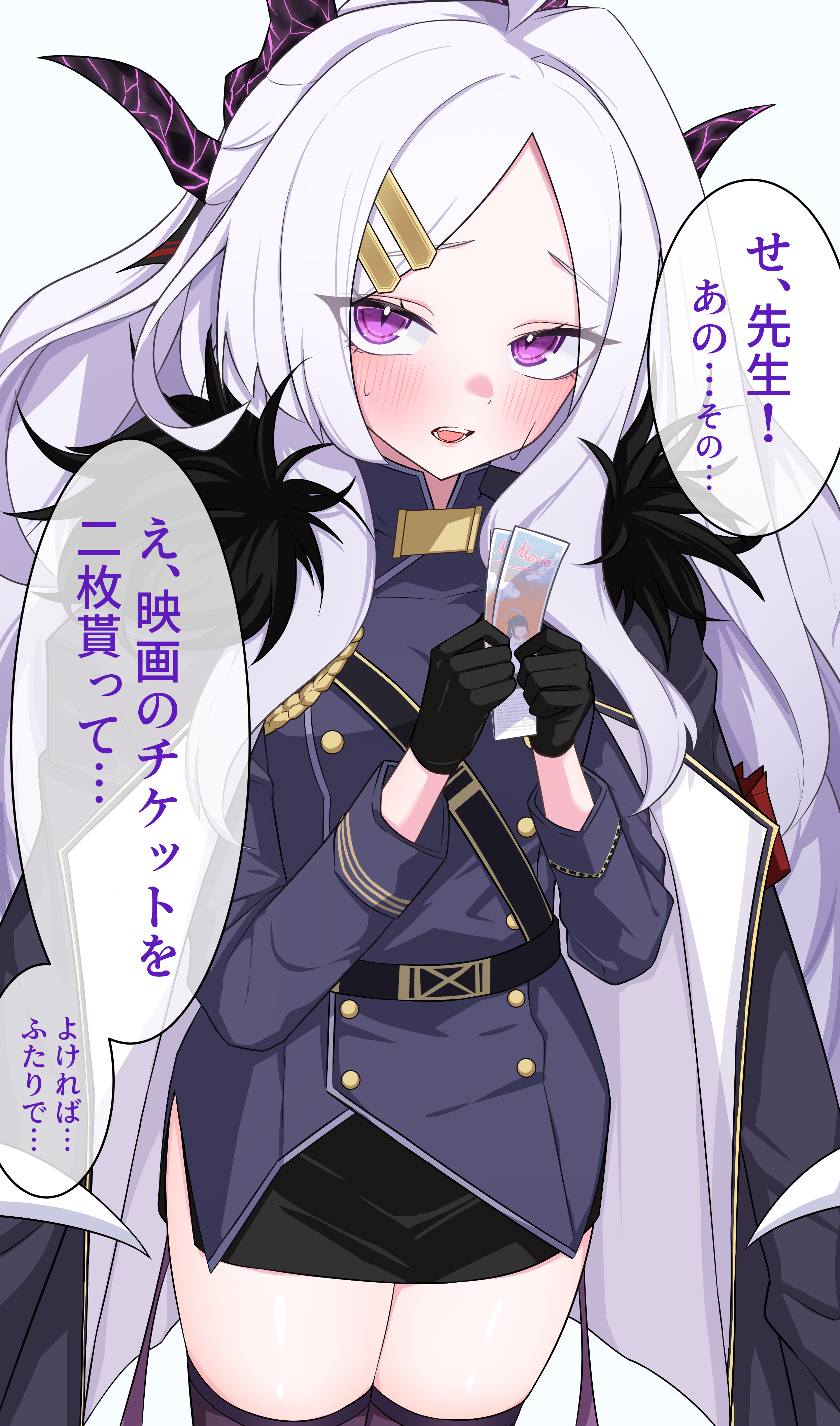 1girlblack coatblack glovesblack thighhighsblushcoatgloveshands upholdinghornslong hairlong sleeveslooking at viewermultiple hornsopen mouthpurple eyessolosweatteeththighhighsvery long hairwhite backgroundwhite hair