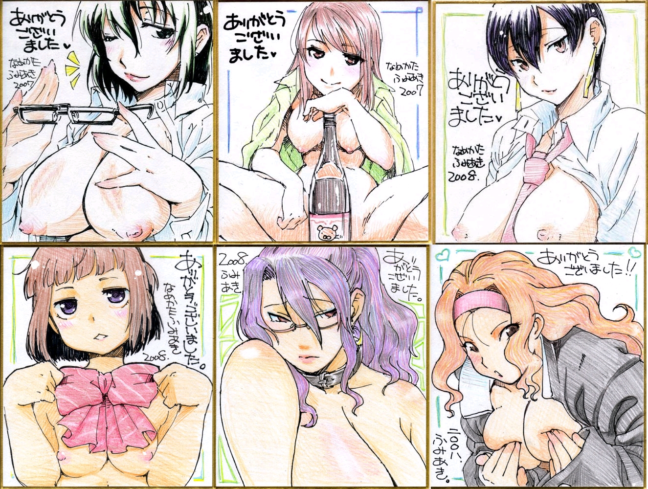 6+girlsblack hairbottlebreastsbrown eyesbrown haircollarglasseslarge areolaelarge breastsmultiple girlsnipplesone eye closedshikishiwink